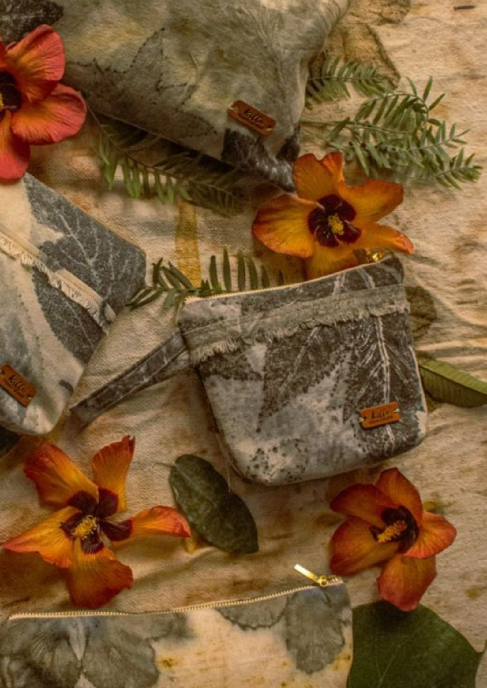 Ecoprint cotton canvas toiletry bag, cosmetic bag, botanical print, original, new, hand dyed, with leaf and flower print.